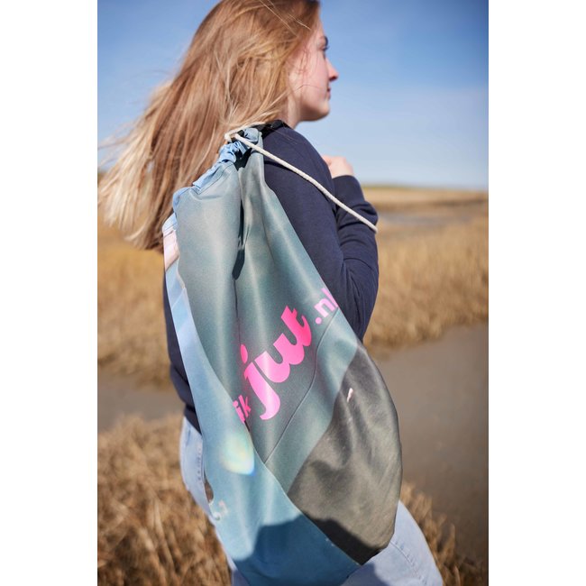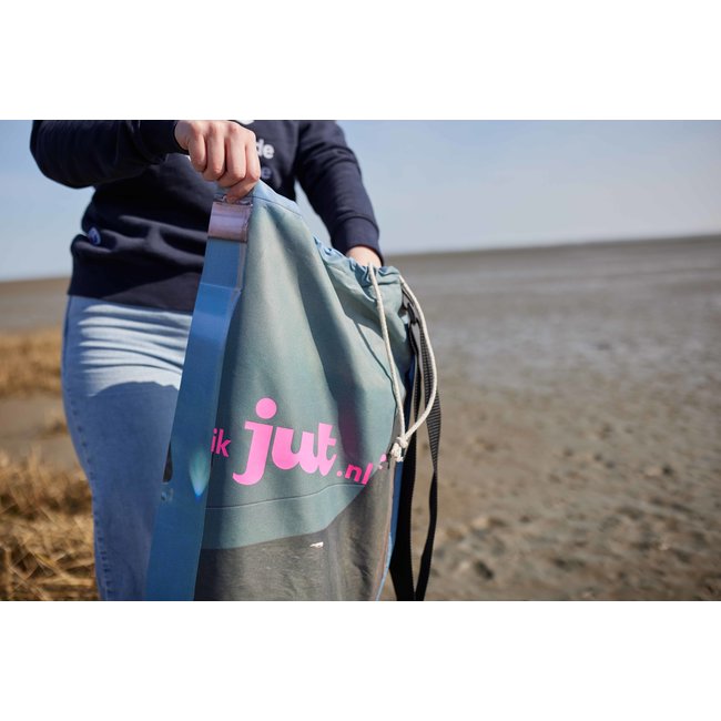 Tijdens het jutten leg je soms behoorlijke afstanden af. Dan is het lekker als je het door jou gevonden afval niet steeds in de hand moet dragen, bijvoorbeeld in een vuilniszak of handtas. Het model van de Wijs Juttas is geïnspireerd op de aloude plunjezak. Eenvoudige cilindervormige zakken van onverwoestbare materialen waarin soldaten, matrozen en vissers hun bagage meenamen. De tas is gemaakt van oude banners van buitenwinkel Bever dus van gerecycled materiaal. Samen maken we de wereld schoner! De Wijs Juttas heeft een grote opening, waar je gemakkelijk je gevonden afval in kwijt kunt. Tijdens het jutten, draag je de tas schuin voor je buik. Door het stevige materiaal waarvan de tas gemaakt is, blijft de opening goed toegankelijk. In één beweging raap je afval op en gooi je het in de tas. Wil je comfortabel lopen, gooi dan de tas over je schouder heen. Na het jutten gooi je het afval via de grote opening gemakkelijk in een container en keer je vervolgens de tas binnenstebuiten om overgebleven zand eruit te schudden